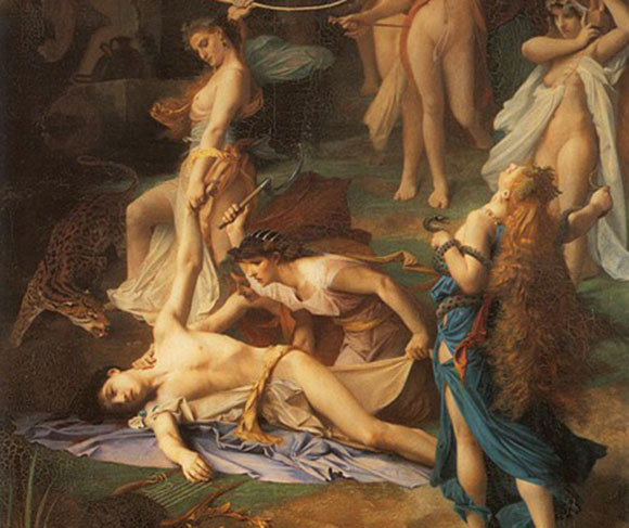 Четыре года прошло со смерти Эвридики, но остался по-прежнему верен ей Орфей. Он не желал брака ни с одной женщиной Фракии. Однажды ранней весной, когда на деревьях пробивалась первая зелень, сидел великий певец на невысоком холме. У ног его лежала его золотая кифара. Поднял ее певец, тихо ударил по струнам и запел. Вся природа заслушалась дивного пения. Такая сила звучала в песне Орфея, так покоряла она и влекла к певцу, что вокруг него, как зачарованные, столпились дикие звери, покинувшие окрестные леса и горы. Птицы слетелись слушать певца. Даже деревья двинулись с места и окружили Орфея; дуб и тополь, стройные кипарисы и широколистые платаны, сосны и ели толпились кругом и слушали певца; ни одна ветка, ни один лист не дрожал на них. Вся природа казалась очарованной дивным пением и звуками кифары Орфея. Вдруг раздались вдали громкие возгласы, звон тимпанов и смех. Это киконские женщины справляли веселый праздник шумящего Вакха. Все ближе вакханки, вот увидали они Орфея, и одна из них громко воскликнула: