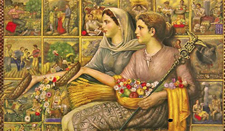 Но каждый год покидает свою мать Персефона, и каждый раз Деметра погружается в печаль и снова облекается в темные одежды. И вся природа горюет об ушедшей. Желтеют на деревьях листья, и срывает их осенний ветер; отцветают цветы, нивы пустеют, наступает зима. Спит природа, чтобы проснуться в радостном блеске весны тогда, когда вернется к своей матери из безрадостного царства Аида Персефона. Когда же возвращается к Диметре ее дочь, тогда великая богиня плодородия щедрой рукой сыплет свои дары людям и благословляет труд земледельца богатым урожаем.
