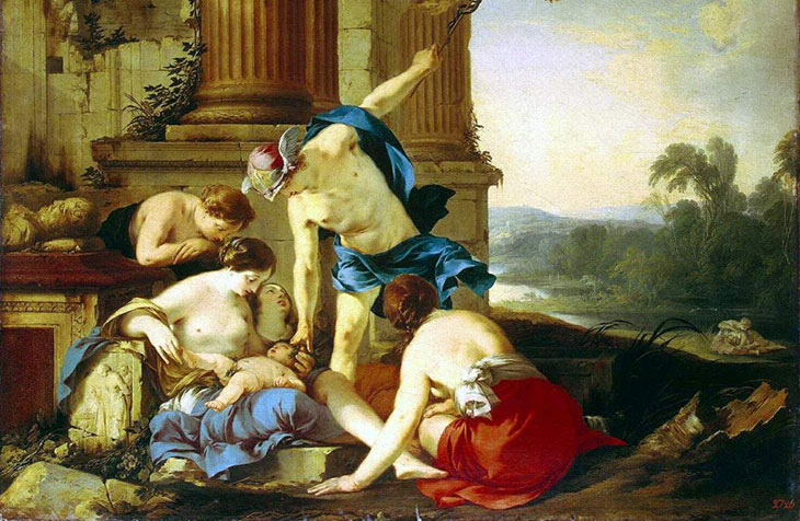 Зевс взял спасенного сына, а так как он был еще так мал и слаб, что не мог бы жить, то зашил его Зевс себе в бедро. В теле отца своего, Зевса, Дионис окреп, и, окрепнув, родился второй раз из бедра громовержца Зевса. Тогда царь богов и людей призвал сына своего, быстрого посланника богов, Гермеса, и велел ему отнести маленького Диониса к сестре Семелы, Ино, и ее мужу Атаманту, царю Орхомена[2], они должны были воспитать его.