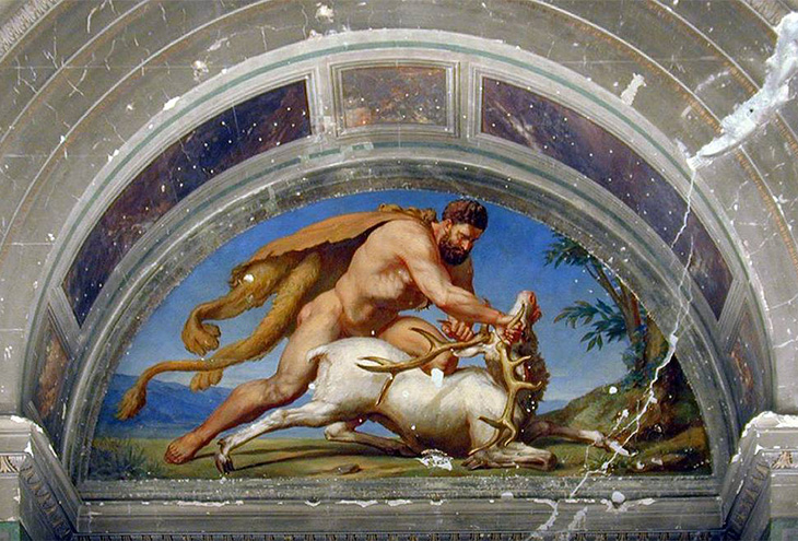 Эврисфей знал, что в Аркадии живет чудесная керинейская лань, посланная богиней Артемидой в наказание людям. Лань эта опустошала поля. Эврисфей послал Геракла поймать ее и велел ему живой доставить лань в Микены. Эта лань была необычайно красива, рога у нее были золотые, а ноги медные. Подобно ветру, носилась она по горам и долинам Аркадии, не зная никогда усталости. Целый год преследовал Геракл керинейскую лань. Она неслась через горы, через равнины, прыгала через пропасти, переплывала реки. Все дальше и дальше на север бежала лань. Не отставал от нее герой, он преследовал ее, не упуская из виду. Наконец Геракл достиг в погоне за падью крайнего севера - страны гипербореев и истоков Истра [1]. Здесь лань остановилась. Герой хотел схватить ее, но ускользнула она и, как стрела, понеслась назад, на юг. Опять началась погоня. Гераклу удалось только в Аркадии настигнуть лань. Даже после столь долгой погони не потеряла она сил. Отчаявшись поймать лань, Геракл прибег к своим не знающим промаха стрелам. Он ранил златорогую лань стрелой в ногу, и только тогда удалось ему поймать ее. Геракл взвалил чудесную лань на плечи и хотел уже нести ее в Микены, как предстала пред ним разгневанная Артемида и сказала: