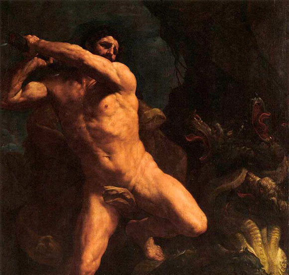После первого подвига Эврисфей послал Геракла убить лернейскую гидру. Это было чудовище с телом змеи и девятью головами дракона. Как и немейский лев, гидра была порождена Тифоном и Ехидной. Жила гидра в болоте около города Лерны [1] и, выползая их своего логовища, уничтожала целые стада и опустошала все окрестности. Борьба с девятиголовой гидрой была опасна потому, что одна из голов ее была бессмертна. Отправился в путь к Лерне Геракл с сыном Ификла Иолаем. Прибыв к болоту у города Лерны, Геракл оставил Иолая с колесницей в близлежащей роще, а сам отправился искать гидру. Он нашел ее в окруженной болотом пещере. Раскалив докрасна свои стрелы, стал Геракл пускать их одну за другой в гидру. В ярость привели гидру стрелы Геракла. Она выползла, извиваясь покрытым блестящей чешуей телом, из мрака пещеры, грозно поднялась на своем громадном хвосте и хотела уже броситься на героя, но наступил ей сын Зевса ногой на туловище и придавил к земле. Своим хвостом гидра обвилась вокруг ног Геракла и силилась свалить его. Как непоколебимая скала, стоял герой и взмахами тяжелой палицы одну за другой сбивал головы гидры. Как вихрь, свистела в воздухе палица; слетали головы гидры, но гидра все-таки была жива. Тут Геракл заметил, что у гидры на месте каждой сбитой головы вырастают две новые. Явилась и помощь гидре. Из болота выполз чудовищный рак и впился своими клещами в ногу Геракла. Тогда герой призвал на помощь своего друга Иолая. Иолай убил чудовищного рака, зажег часть ближней рощи и горящими стволами деревьев прижигал гидре шеи, с которых Геракл сбивал своей палицей головы. Новые головы перестали вырастать у гидры. Все слабее и слабее сопротивлялась она сыну Зевса. Наконец и бессмертная голова слетела у гидры. Чудовищная гидра была побеждена и рухнула мертвой на землю. Глубоко зарыл ее бессмертную голову победитель Геракл и навалил на нее громадную скалу, чтобы не могла она опять выйти на свет. Затем рассек великий герой тело гидры и погрузил в ее ядовитую желчь свои стрелы. С тех пор раны от стрел Геракла стали неизлечимыми. С великим торжеством вернулся Геракл в Тиринф. Но там ждало его уже новое поручение Эврисфея.