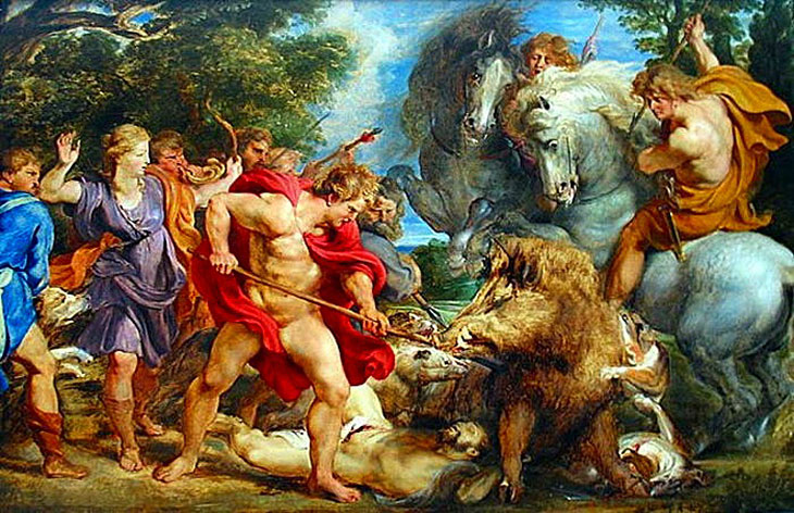 Девять дней пировали собравшиеся герои у гостеприимного Ойнея. Наконец, они отправились на охоту за кабаном. Окрестные горы огласились громким лаем многочисленных свор собак. Собаки подняли громадного кабана и погнали его. Вот показался мчащийся вихрем кабан, гонимый собаками. Бросились к нему охотники. Каждый из них спешил поразить кабана своим копьем, но тяжела была борьба с чудовищным кабаном, не один из охотников изведал силу его страшных клыков. Насмерть поразил кабан своими клыкам и неустрашимого охотника, аркадца Анкейя, когда он, замахнувшись своей обоюдоострой секирой, хотел убить кабана. Тогда Атланта натянула свой тугой лук и пустила в кабана острую стрелу. В это мгновенье подоспел и Мелеагр. Могучим ударом копья убил он громадного кабана. Кончилась охота. Все радовались удаче.