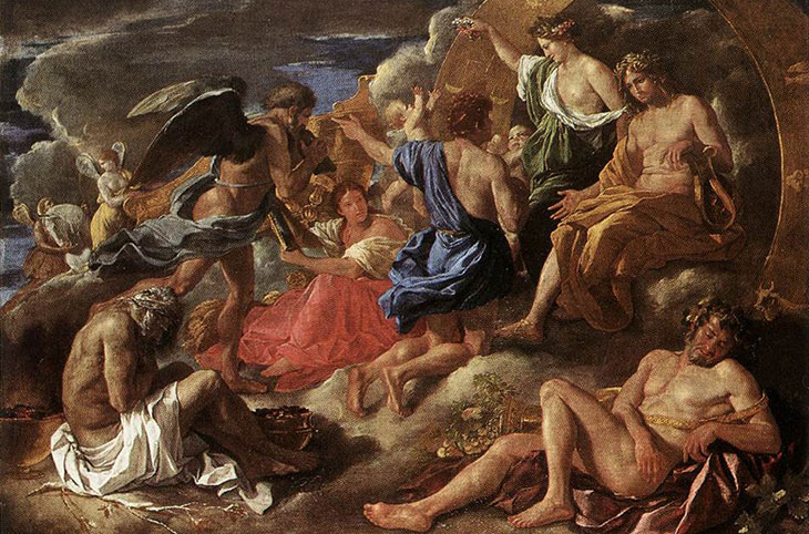 На четверке крылатых коней в золотой колеснице, которую выковал бог Гефест, выезжает на небо с берегов Океана лучезарный бог. Верхи гор озаряют лучи восходящего солнца, и они высятся, как бы залитые огнем. Звезды бегут с небосклона при виде бога солнца, одна за другой скрываются они в лоне темной ночи. Все выше поднимается колесница Гелиоса. В лучезарном венце и в длинной сверкающей одежде едет он по небу и льет свои живительные лучи на землю, дает ей свет, тепло и жизнь.