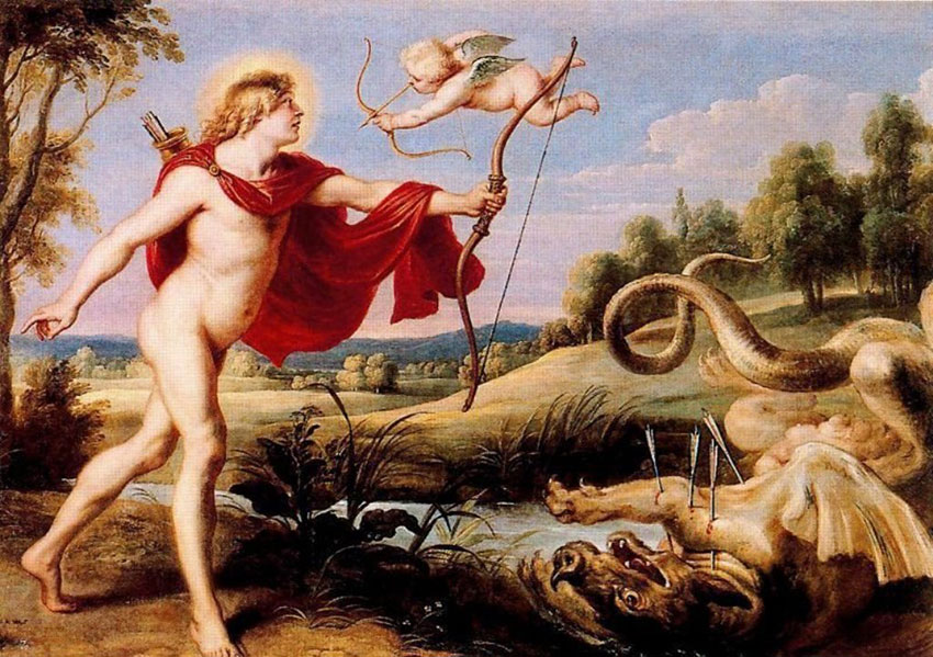 Быстро достиг Аполлон мрачного ущелья, жилища Пифона. Кругом высились скалы, уходя высоко в небо. Мрак царил в ущелье. По дну его стремительно несся, седой от пены, горный поток, а над потоком клубились туманы. Выполз из своего логовища ужасный Пифон. Громадное тело его, покрытое чешуей, извивалось меж скал бесчисленными кольцами. Скалы и горы дрожали от тяжести его тела и сдвигались с места. Яростный Пифон все предавал опустошению, смерть распространял он кругом. В ужасе бежали нимфы и все живое. Поднялся Пифон, могучий, яростный, раскрыл свою ужасную пасть и уже готов был поглотить златокудрого Аполлона. Тогда раздался звон тетивы серебряного лука, как искра сверкнула в воздухе не знающая промаха золотая стрела, за ней другая, третья; стрелы дождем посыпались на Пифона, и он бездыханный упал на землю. Громко зазвучала торжествующая победная песнь (пэан) златокудрого Аполлона, победителя Пифона, и вторили ей золотые струны кифары бога. Аполлон зарыл в землю тело Пифона там, где стоят священные Дельфы, и основал в Дельфах святилище и оракул, чтобы прорицать в нем людям волю отца своего Зевса.