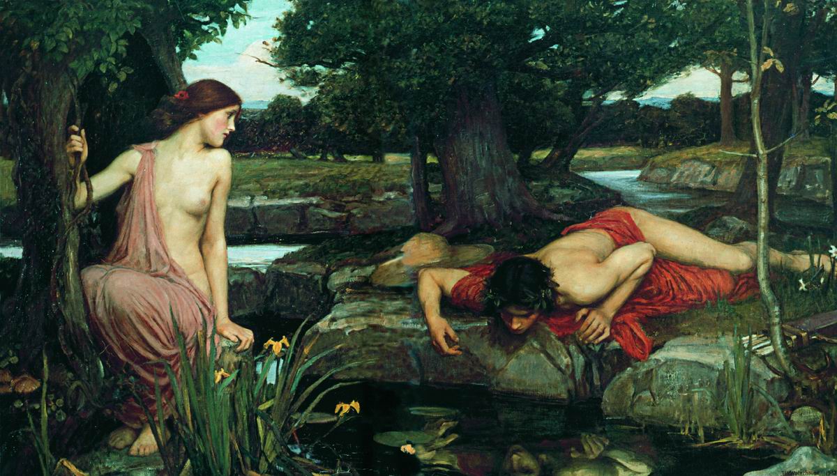 Прошло какое-то время, и Нарцисса постигла печальная участь – он достиг апогея собственного эгоцентризма и влюбился в самого себя, а точнее – в свое отражение в реке. Не в состоянии уйти от себя любимого, он не то пронзил себя кинжалом, не то просто умер от голода, любуясь очаровательным образом. И бедная Эхо в тоске и печали провела с юношей его последние часы. После гибели любимого свет стал не мил всюду неудачливой нимфе. Как настоящая женщина, Эхо вместила в себя не только женские недостатки, но и те черты, которые воспеваются в женщине – верность и глубину чувства. Скитаясь в диких краях, нимфа стала источаться от горя, и однажды от нее не осталось ничего, кроме горстки костей, превратившихся в камни, и ее голоса.
