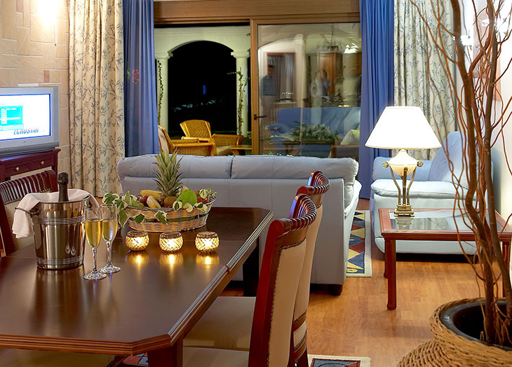 богатый номерной фонд (от стандартных номеров до президентский вилл) с эксклюзивным декором и обширное кулинарное разнообразие с тематическими вечерами – общая черта всех трех отелей сети.