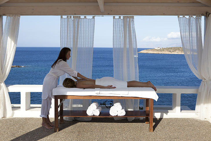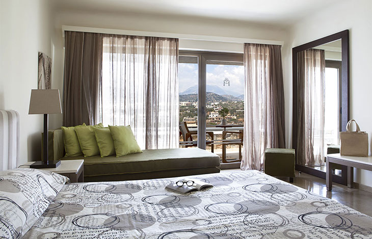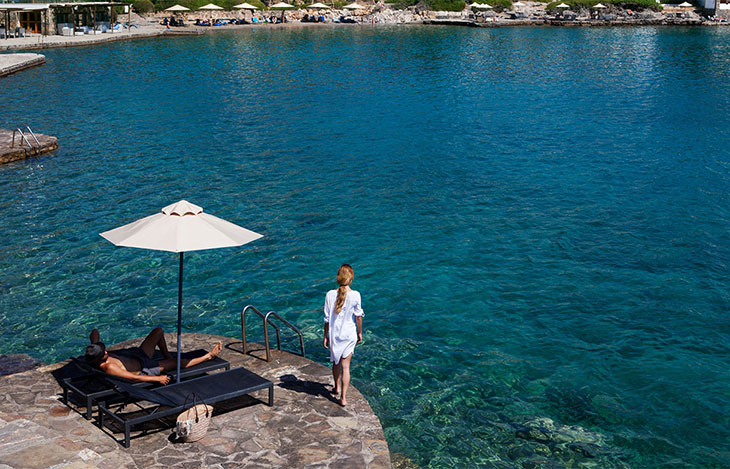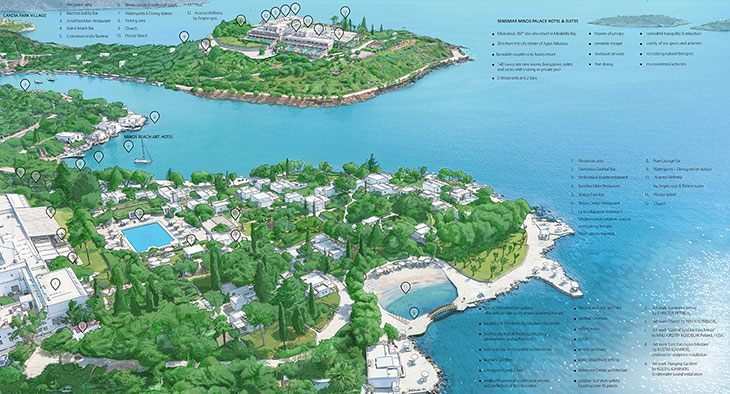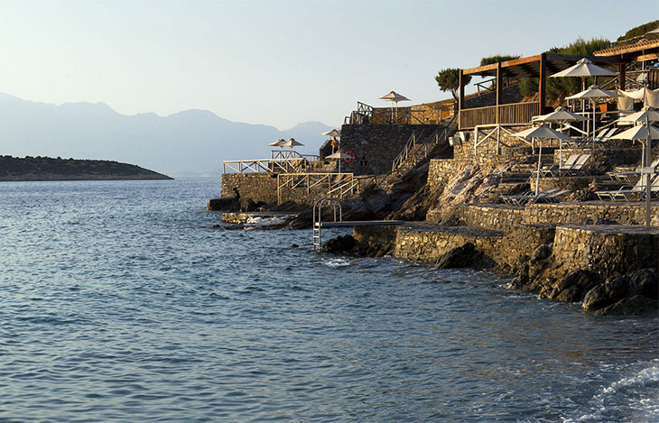 Наверное, главной фишкой этого отеля является потрясающий панорамный вид на море, который будет вашим постоянным спутником в каком бы номере вы не поселились. Другая особенность Sensimar Minos Palace – исключительная уединенность. Она достигается за счет расположения на скалистом мысе, выдающемся в море, т.е. с трех сторон всю территорию отеля окружает сплошное море.