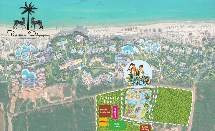 Все дело в том, что сам аквапарк расположен в Парке Активного Отдыха Riviera Olympia, занимающего в общей сложности территорию в 40 тыс. кв.м и располагающего уникальными игровыми площадками с безграничными возможностями для активного отдыха и развлечений.
