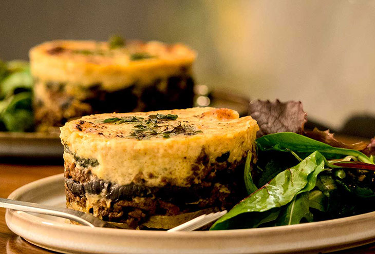 Это блюдо сочетает в себе типичные ингредиенты греческой кухни, такие как сладкие перцы и сочные баклажаны, но вместо мяса добавляем пюре из чечевицы (также очень типичное для греческих домашних хозяйств). Просто поджариваем овощи и помещаем их послойно в посуду для запекания. Завершите это соусом бешамель и подайте к столу.