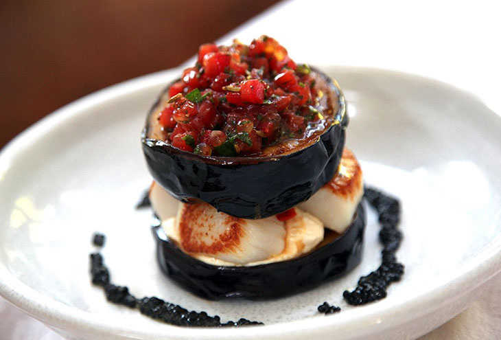 Попробуйте фьюжн-версию мусаки, используя кремовые морские гребешки и баклажаны для основы блюда, одновременно нанося острую томатную сальсу между слоями классической греческой тарамосалаты.