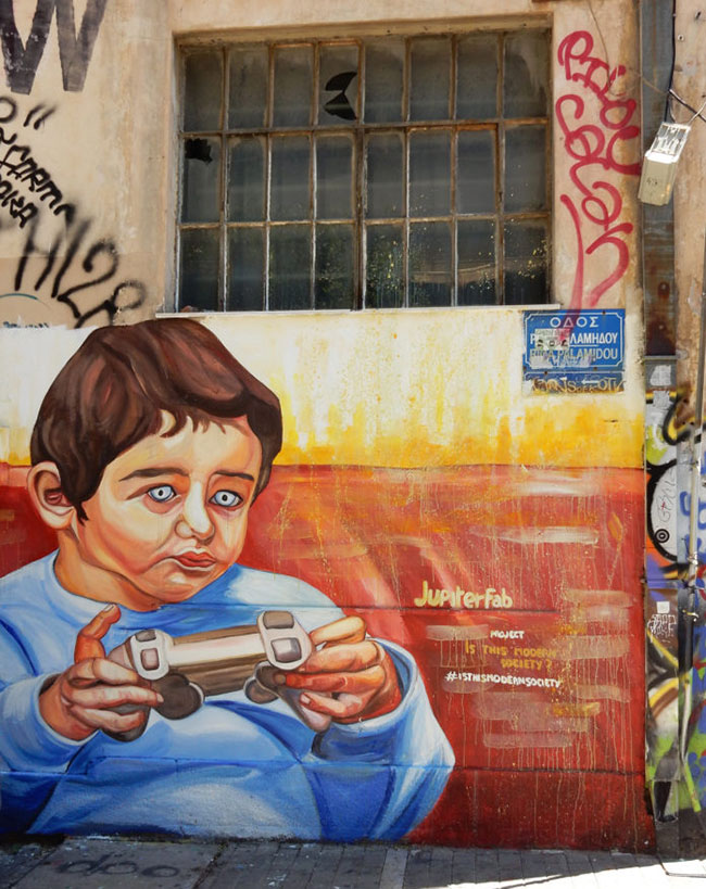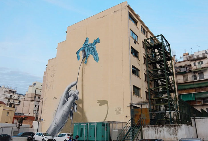 Это произведение уличного искусства художника Юпитерфаба (Jupiterfab) было написано в 2018 году. Его можно найти на Псирри, Афины.