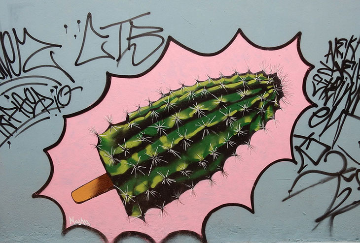 Следующий фрагмент граффити - ожидаемый поворот в классическом летнем угощении. Художница по имени Майя превзошла ожидания, превратив эскимо в кактус.