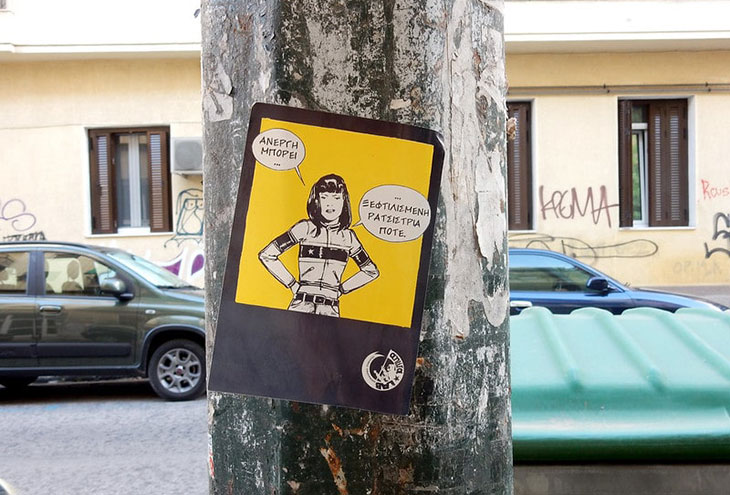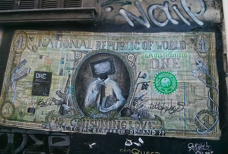 Это произведение уличного искусства было создано в 2014 году известным греческим художником-граффити Наипом Н_Грамсом (Naip N_Grams). Это произведение, которое можно найти на Экзархии, напоминает множество других антикапиталистических произведений искусства в этом районе.