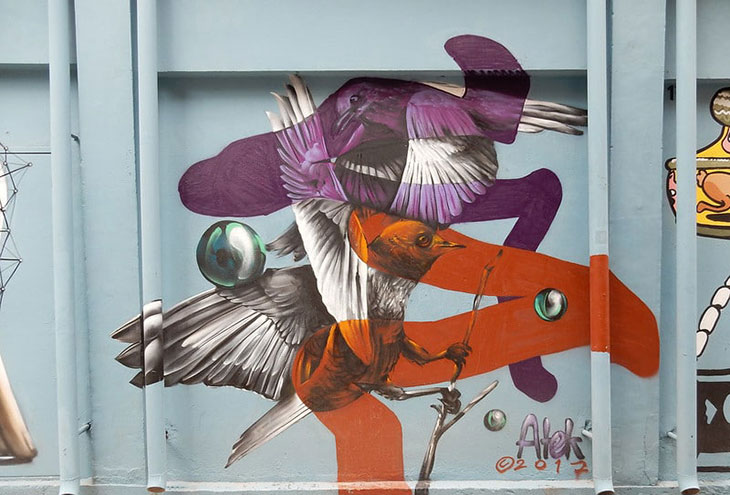 Этот потрясающий панно был написан Атеком (Atek) в 2017 году на Псирри. Простая работа под названием «Птицы» изображает двух красивых черно-белых птиц на фоне разных цветов. «Бусинки», плавающие вокруг птиц, кажутся открытыми для интерпретации и могут быть поняты как шарики, бусинки или даже глаза птицы.