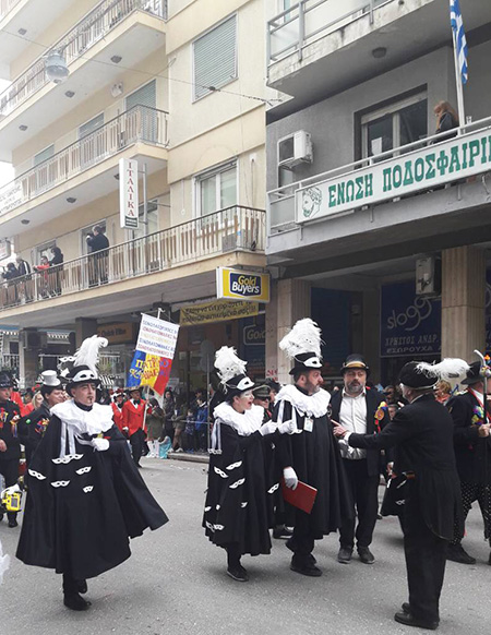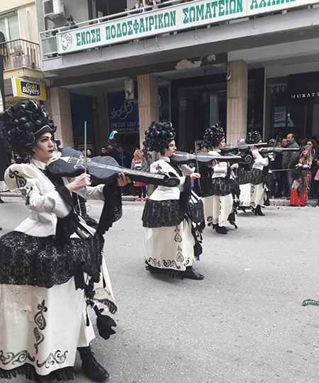 У многих из танцующих барабаны, трубы, цветные ленты, бумажные, деревянные, металлические конструкции и даже факелы и дымовые шашки в руках. Обязательный атрибут участников, которые просто наблюдают за шествием, маскарадные костюмы и свистки. Чем больше шума, тем дальше услышат, что за невероятный праздник сегодня в Патрах!