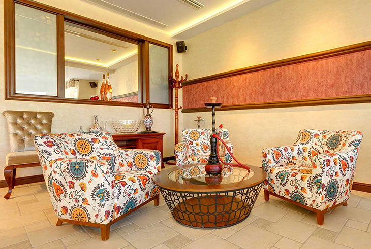 Что же касается оформления помещения, то оно вас однозначно удивит. Ресторан разделен на несколько зон, каждая из которых выполнена в индивидуальном стиле. При этом во всех из них явно чувствуются непринужденная роскошь, элегантность и колоритные восточные мотивы.