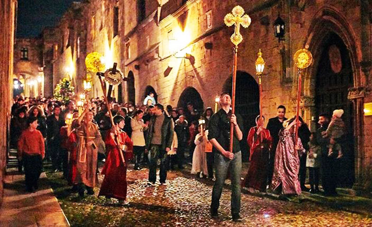 Жемчужина Средиземноморья, Родос не удивляет какими-либо экстраординарными традициями либо украшениями на Пасху. Ему этого и не нужно. Оплот рыцарей-иоаннитов, одноименная островная столица, как вам хорошо известно, буквально усеяна фортификациями, замками и дворцами. Если в течение 364 дней года эти виды «просто» впечатляют своей монументальностью, то во время пасхальных процессий складывается ощущение, что город Родос вновь вернулся в добрые старые рыцарские времена. Именно такую атмосферу создают многолюдные шествия по средневековым улицам Родоса.