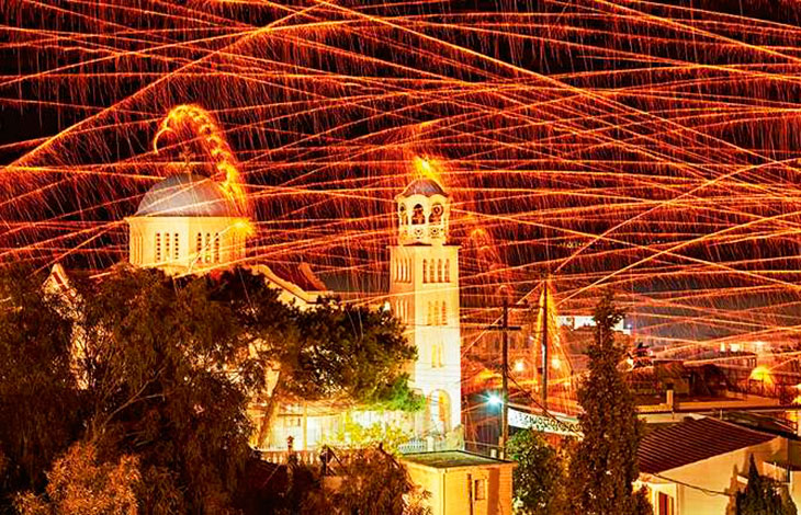 Ракетная Война, которая разделяет островитян на два «враждующих» лагеря – сторонников церкви Св. Марка и приверженцев обители Панагии Эрифиани. Противоборство выражается в красочном фейерверк-шоу, в рамках которого жители острова запускают в направлении «враждующего» лагеря сотни пиротехнических ракет всех цветов и оттенков. Красочное зрелище стартует в вечерние часы и длится вплоть до полуночи.
