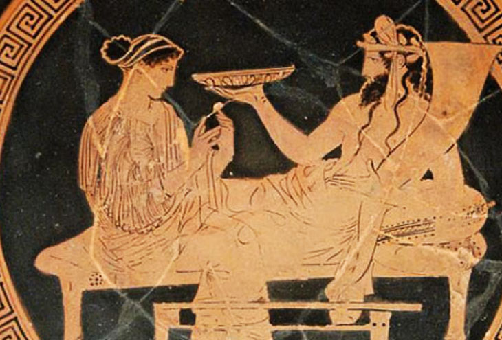 Сохранившиеся изображения на бесчисленных произведениях искусства, включая глиняную посуду, фрески, винные чашки и скульптуры, часто изображают древних греков, лежащих на боку по время трапезы.