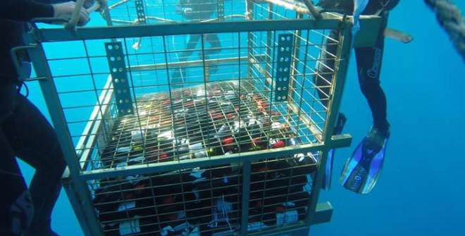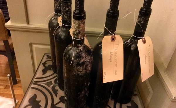 История старения бутылок в воде началась в 2010 году, когда 450 бутылок погрузили в специальную клеть и опустили на глубину 15 метров в море у берегов Санторини.