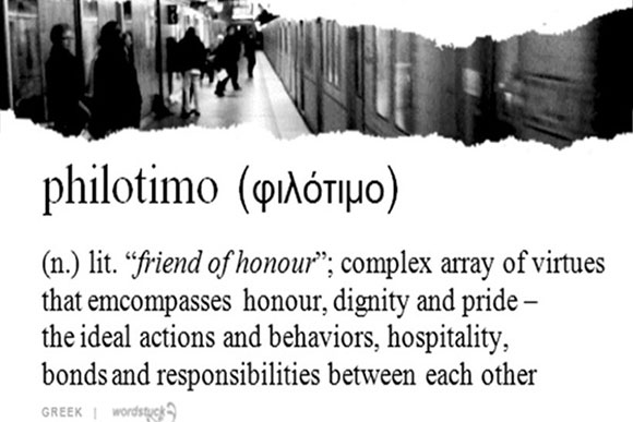 В «Руководстве уникальных слов», продукте нового общеевропейского совещания, проходившего несколько месяцев назад в Эдессе, группа греков дала определение, что «филотимо - это, когда ставишь потребности других выше собственных и ничего не ожидаешь взамен».
