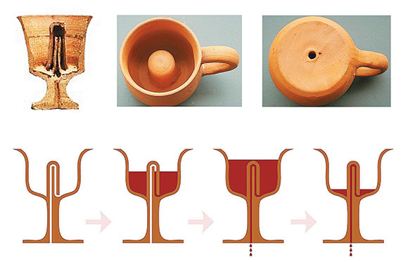 Эту умную чашу для вина придумал в 6 веке до н.э. Пифагор Саммоский, древнегреческий математик, философ и политик. Когда кто-то хочет налить в неё побольше вина, то она опорожняется автоматически.