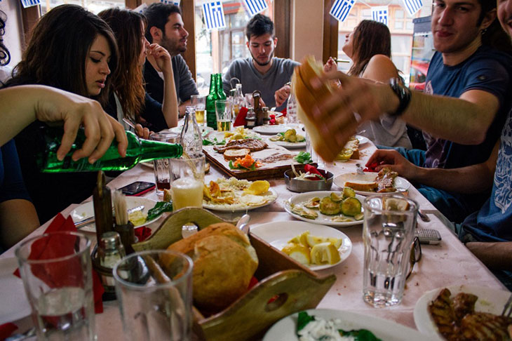 Греки любят вкусно поесть, но еще больше они любят шумные застолья в окружении родных, близких и не только, причем чем больше людей за столом, тем лучше. «Застолье – сводит на нет границы между незнакомыми людьми. Это путь Греции, это также путь нашей семьи – предоставить людям пищу, показать свою любовь и внимание…», – написала как-то раз писательница Агапи Стасинопулос, выразив в этих словах всю суть греческой души.