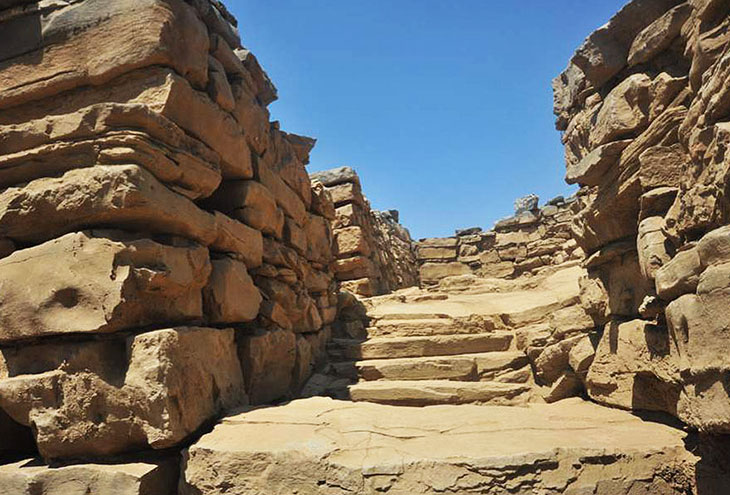 Территория была вымощена камнями дважды в течение 1700–1600 гг. до н.э., а в самой подпорной стене был образован наклонный ритуальный коридор.