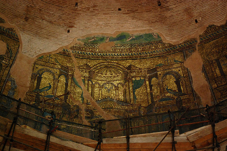 Здесь хочется говорить шепотом. Или просто молчать, запрокинув голову к куполу. Очень часто внутри помещения, действительно, никого нет. В такие часы нетрудно слиться воедино с той эпохой, когда мозаики на стенах, арках и куполе сверкали и переливалась, когда удивительные птички, помещенные в замысловатый орнамент, казались почти живыми, когда изображенные дворцы внутри Ротонды затмевали своей сказочностью само сооружение.