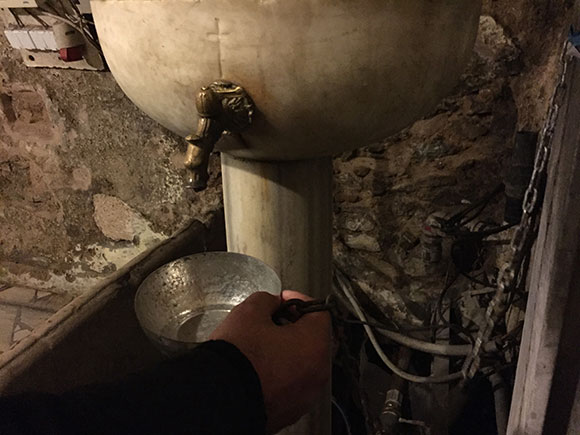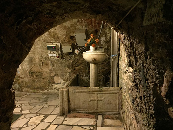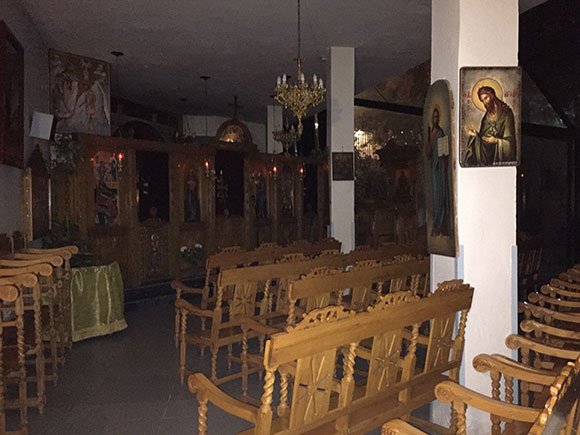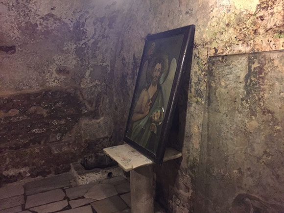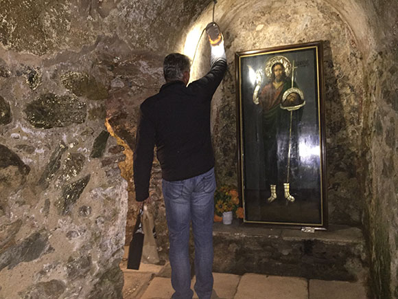 Горят свечи, распахнуты двери и… никого! Из плохо освещенного маленького пространства с креслами, где проходит служба, каменная лестница увлекает вниз, в каменные катакомбы, где по стенам зеленоватых каменей скользят загадочные тени, где слышится бульканье воды и заставляют оборачиваться неожиданные звуки.