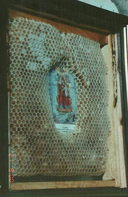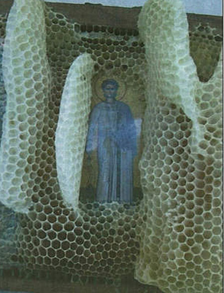 10 лет назад пчеловод Исидорос Тиминис из Капандрити близ Афин поместил в улей икону Распятия Господня. Однако он не ожидал увидеть такое! Через некоторое время, на его удивление, вся икона была покрыта воском, кроме тела и лица Иисуса.