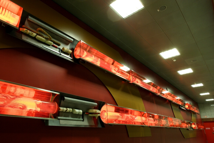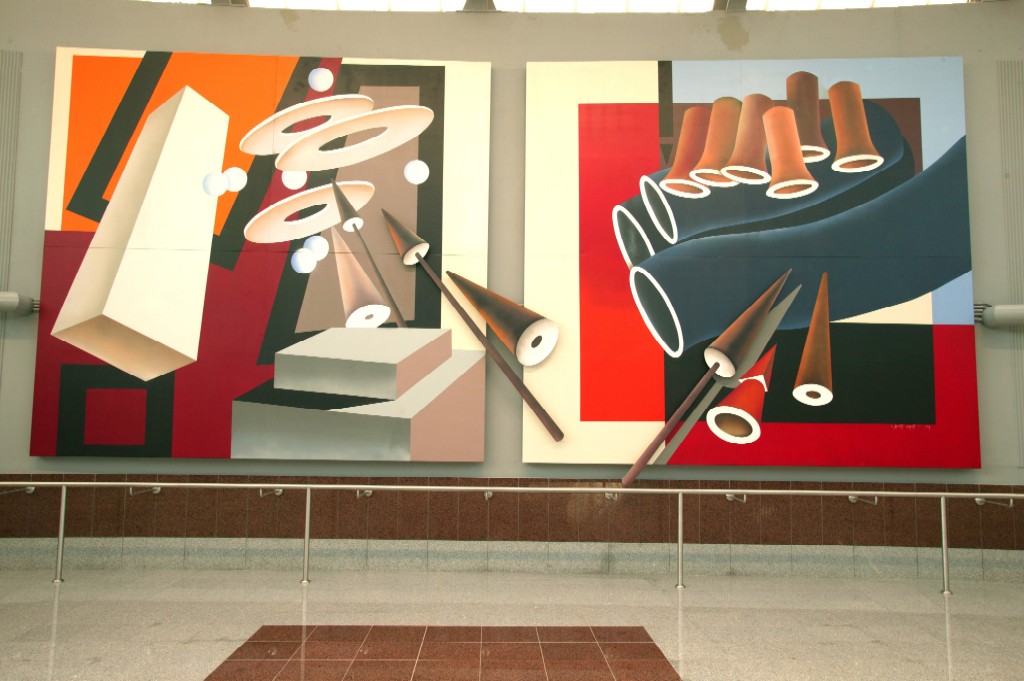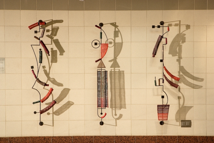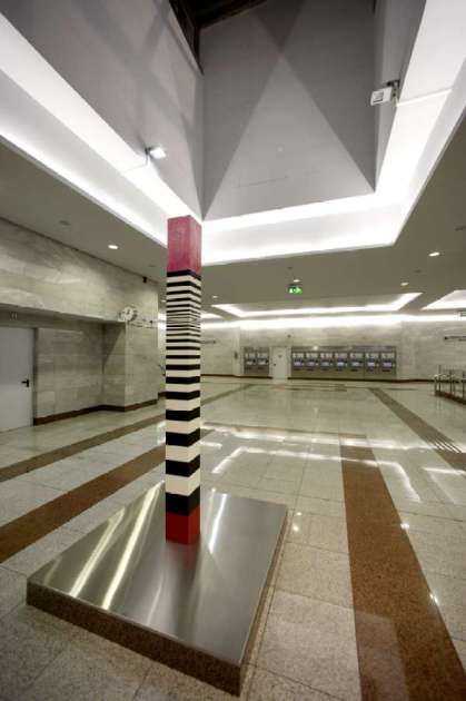 На станции Эгалео установлен характерный столбец с полосами, продолжающий серию творений «скульптур и сооружений в пространстве».