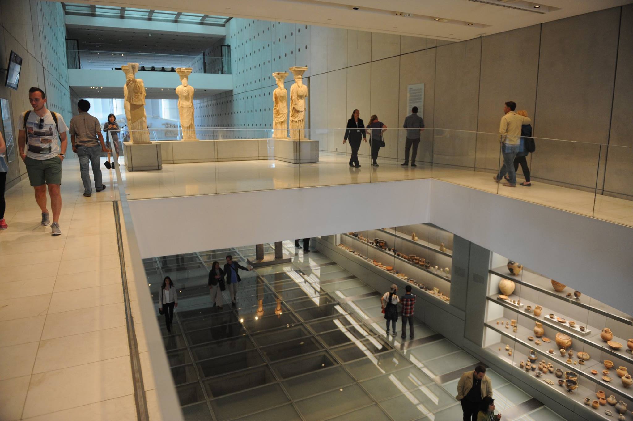Кто из нас, побывав в жарких объятиях Акрополя, не мечтал сбежать, в конце концов, в прохладу его музея? И всё же, несмотря на то, что солнце к обеду палило нещадно, я медлила, не спешила юркнуть в кондиционированные залы, и как завороженная бродила в нескольких метрах от входа. Через стекло под ногами было очень хорошо видно, что там, на «плюс нулевом» этаже музея, который обнаружили археологи.