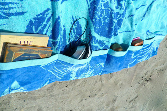 Ваши вещи будут защищены и аккуратно распределены, если на пляже или у бассейна вы будете использовать полотенце с кармашками. Если вы не хотите покупать новое полотенце, преобразуйте уже имеющееся полотенце, подвернув его край на 15 сантиметров, а затем прошейте и сделайте карманы по размеру необходимых вам вещей.
