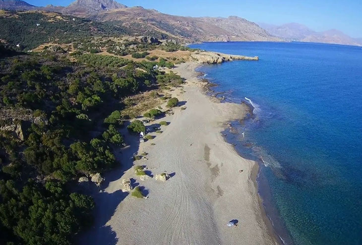 Расположенный на юго-западной стороне Крита, пляж имеет мягкий белый и розовый песок, а побережье обрамлено кедровыми деревьями.