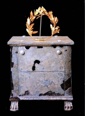 И, наконец, привлекает внимание золотой венок, украшающий серебряный погребальный ларец, в котором был обнаружен прах офицера древней Спарты Врасидиса (Брасида), жившего в 422 году до н.э.