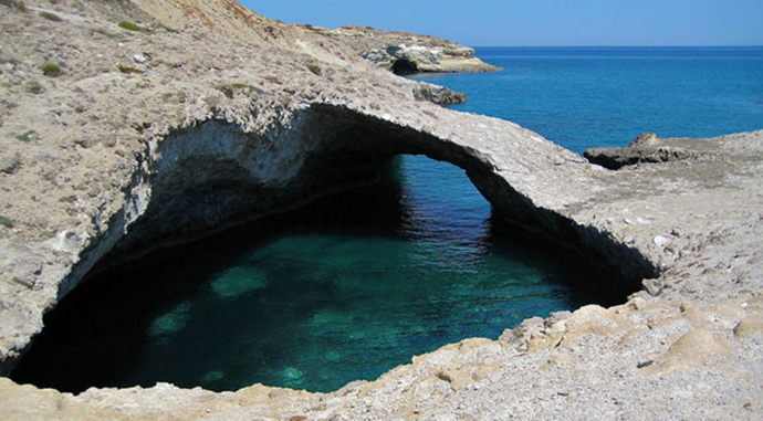 Вулканический меловой остров, в составе почве которого глина с редкими, красивыми геологическими формациями. Здесь есть много подводных пещер, самая красивая из которых Геракья. Морская пещера находится в самой северной точке острова, куда можно добраться только тот, кто имеет лодку или сумеет убедить рыбака, чтобы он похвастался редкой красотой и кристально чистой бирюзовой водой. Море Геракьи также скрывает еще один сюрприз для своих посетителей – на мелководье можно найти удивительные природные образования.