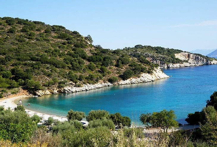Этот длинный пляж имеет кристально чистую бирюзовую воду, и сосны, которые почти касаются воды. Многие по праву называют его лучшим пляжем Итаки. Вы найдете зонтики и шезлонги напрокат, а также столовую для предметов первой необходимости. Дороги к пляжу нет, и вариантов, как добраться сюда, два: либо на лодке из порта Итаки, где вам понравится маршрут, так как можно наблюдать за береговой линией с моря, либо на машине до пляжа Скинос и по относительно легкому тридцатиминутному пути через сосны.