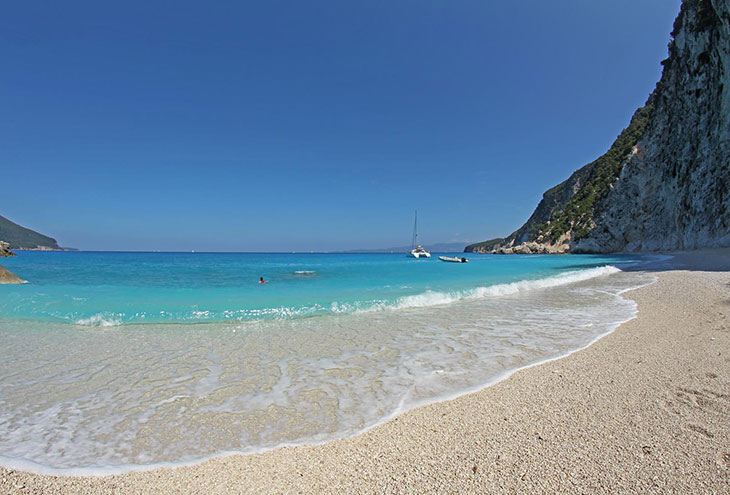 Он получил свое название от белой гальки. Это красивейшая бухта со скалами справа и слева. В нем нет пляжного бара, но есть несколько зонтиков и шезлонгов, которые можно взять напрокат. Камешки могут быть для вас крупноватыми, поэтому лучше иметь пляжную обувь с зонтиком, потому что там нет тени. Воды темно-синие и кристально чистые. Если у вас есть маска, морское дно очарует вас. В ясную погоду вы увидите Кефалонию на заднем плане.