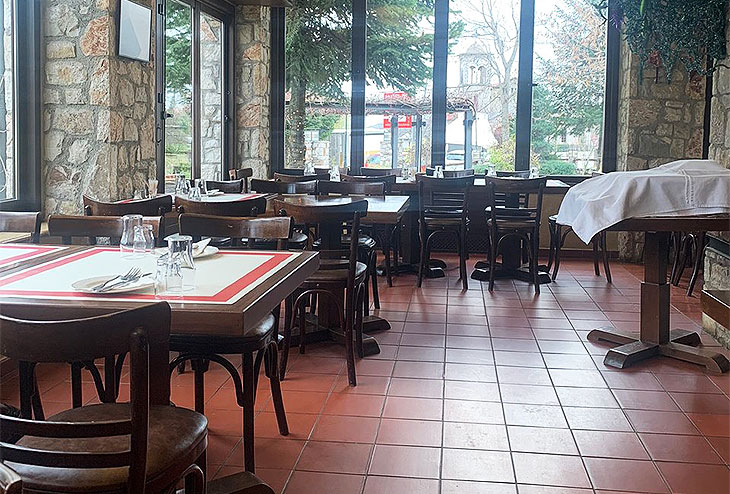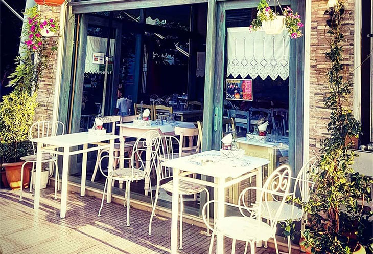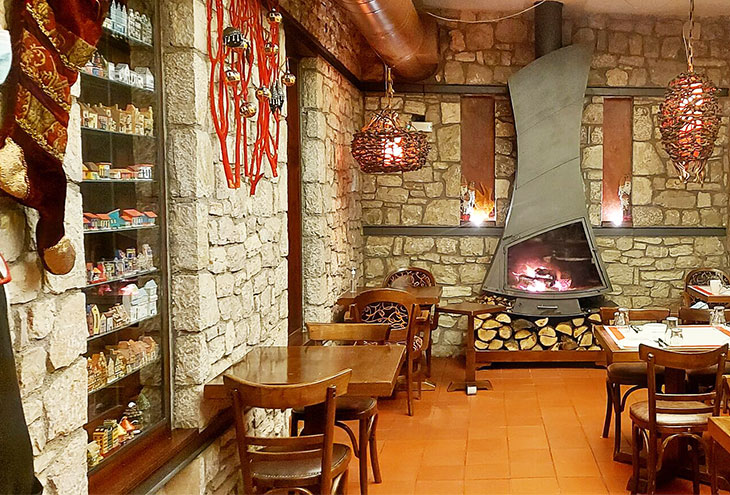 Задний холл с арочными каменными стенами, столы и стулья из темного дерева и теплые тона создают гостеприимную, уютную атмосферу. Вестибюль в передней части более современный, здесь выставлено около 1000 миниатюрных домиков, и у него есть большое преимущество в виде больших окон, так что вы можете смотреть на улицу. Меню - одно из немногих, в котором есть блюда карагунидской кухни, вероятно, потому, что хозяйка, Ксения Псифи, имеет корни Карагунидов по отцовской линии. Вы найдете запеканки из кабана с луком-пореем, кабана с каштанами и сливами, баранину или баранину в супе из булгура. Другие варианты включают блюда из форели - пасту фава с копченой форелью или тальятелле с копченой форелью и укропом. Паста из баранины, шарики из баранины с йогуртовым соусом из овечьего молока и, конечно же, пластос и батзина. У них есть овощи из собственного огорода и хлеб на закваске.