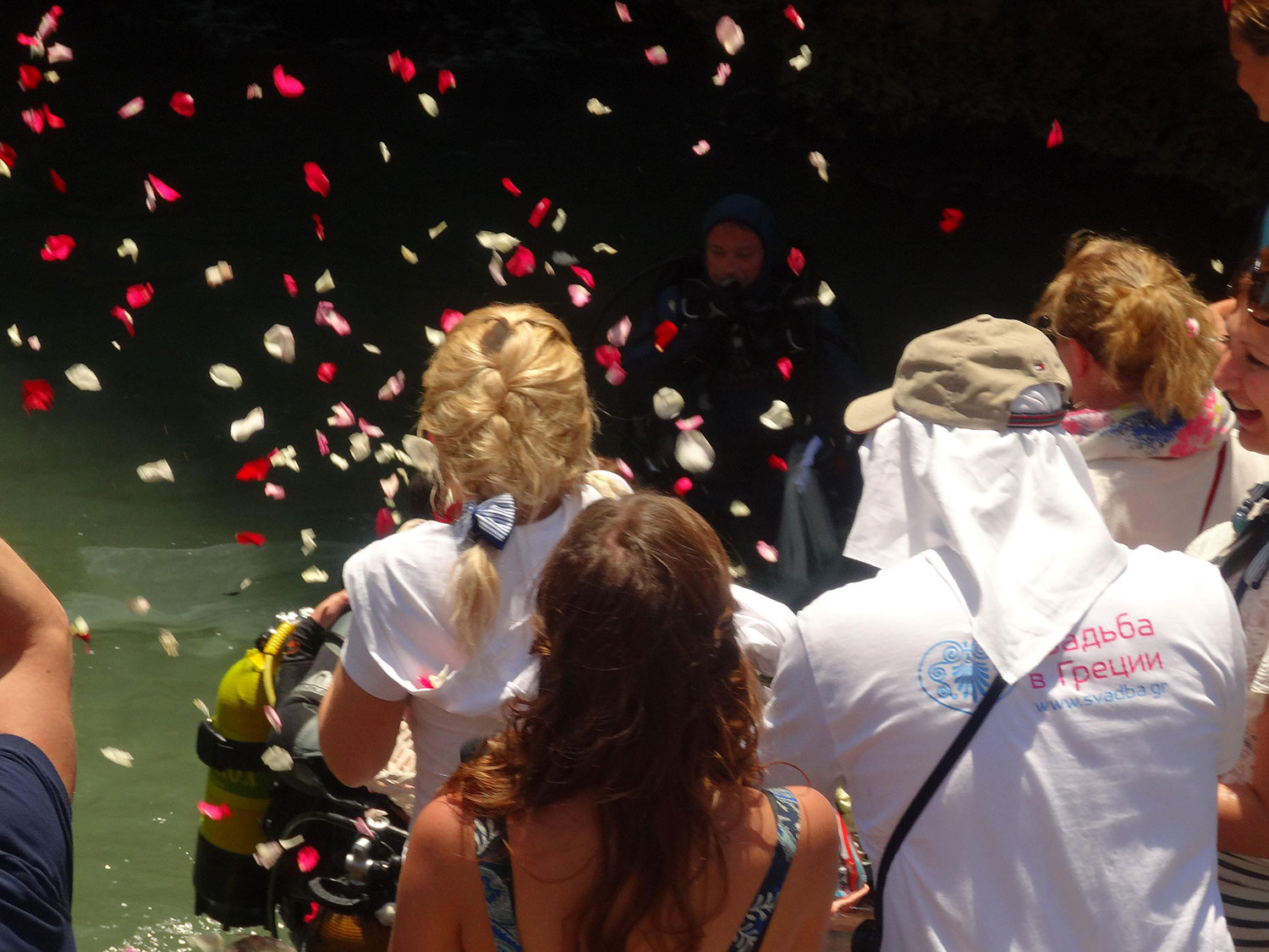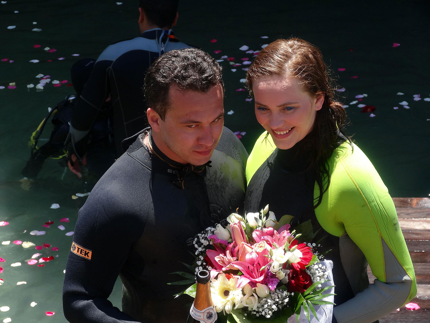 Погрузиться под воду молодоженам помогала команда дайверов.
