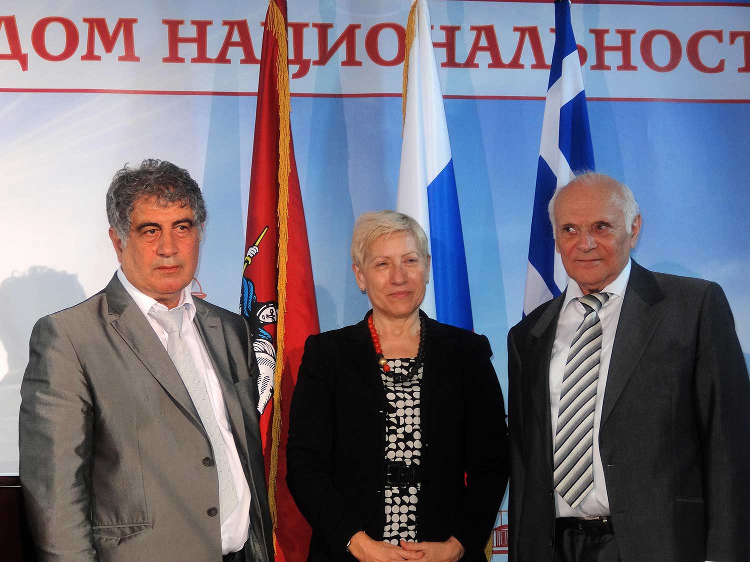 Председатель Московского общества греков Архимед Шахбазов /слева/, Посол Греции в России г-жа Данаи-Магдалини Куманаку и Автор и составитель книги "Наш Одиссей" Яннис Кесисов