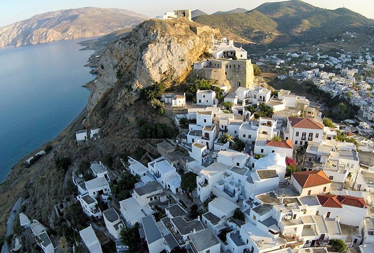 Главный город острова, Хора, представляет собой живописную деревню с побеленными домами, узкими улочками и красочными бугенвиллиями. Центральным элементом города является венецианский замок 15-го века, из которого открывается панорамный вид на остров и окружающее море.