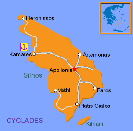 Начать знакомство с Сифносом следует, пожалуй, с его столицы – Аполонии. Как и на многих других островах Греции, главный город здесь именуется также Хора. Самый крупный населенный пункт острова, Аполония расположилась в его центре, раскинувшись амфитеатром на трех холмах.
