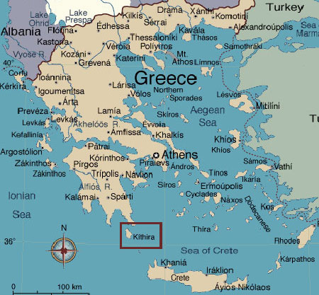Если кто-то хочет провести воображаемую линию в середине карты Китиры, он «соединит» две главных достопримечательности острова: пещеру Святой Софии в районе Милопотамос на западе и гору Святого Георгия с минойским святилищем на вершине в районе, расположенном между Диакофти и Авлемонасе на востоке.
