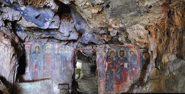 У входа в пещеру расположился храм Святой Софии, где Святая изображена с дочерьми Верой, Надеждой и Любовью на стене слева от красивых ворот. Сохранившиеся фрески были написаны в 13-м веке.