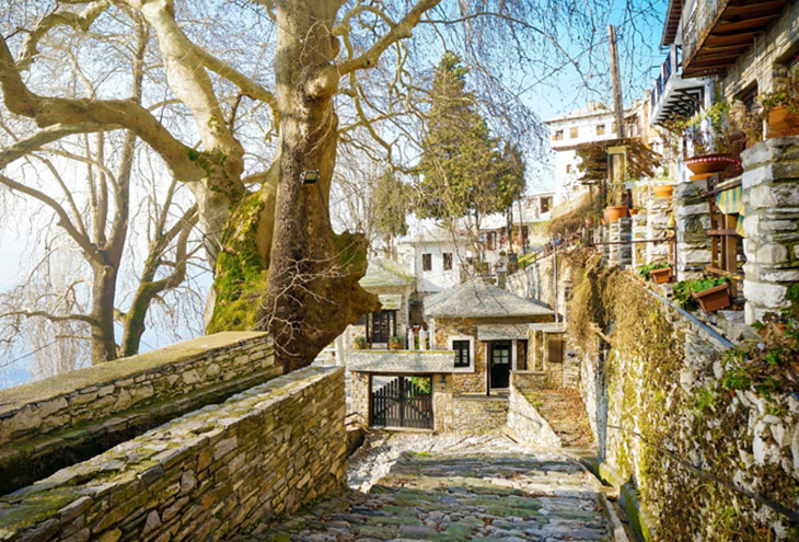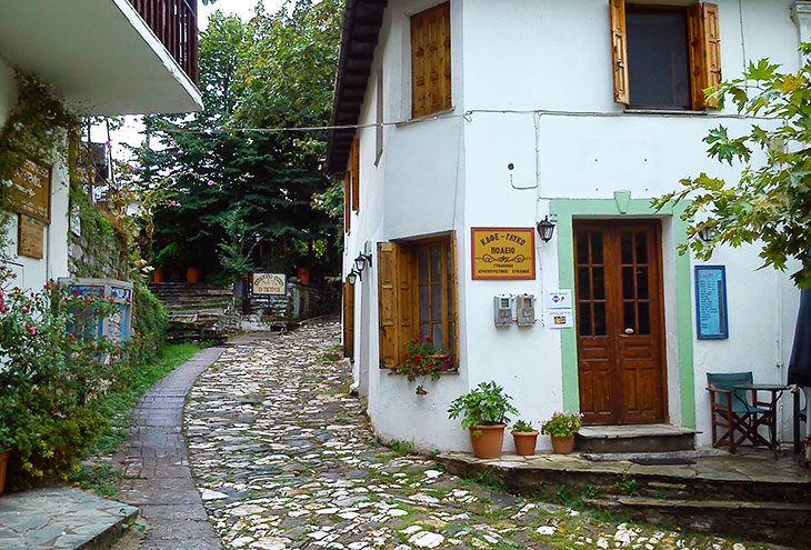 Наряду с ними интерес вызывает также самобытный архитектурный облик деревни, выдержанный в традиционном для Греции 17-18 веков стиле с декоративными ложными окнами и покрытыми искусной резьбой деревянными дверьми исторических домов.