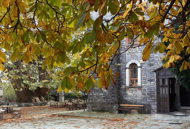 Древнее дерево является настолько большим, что в тени его ветвей смогли разместиться как площадь с несколькими кафе под открытым небом, так и церковь Агиа Параскеви.