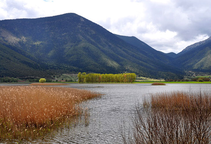 На высоте 680 метров на плато, независимо от того, какое время года вы выберете для посещения, вы будете очарованы его изысканной красотой. Весной и летом цвета очаровывают, а зимой озеро окружают снежные вершины Зирии и Олигиртос.
