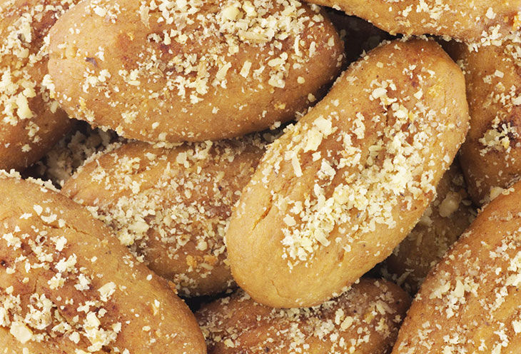 Смешать муку с разрыхлителем, содой и остальными ингредиентами. Добавить воды столько, чтобы тесто не было жидким. Из теста вылепить небольшие овалы, приблизительно 5х2, и печь в противне, заранее смазанном маслом, в течение 30-35 минут при температура около 180 ο С.